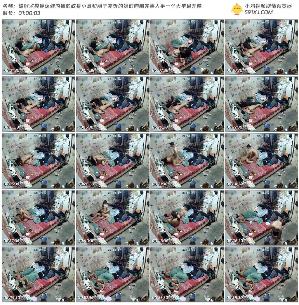 破解监控穿保健内裤的纹身小哥和刚干完饭的媳妇啪啪完事人手一个大苹果开啃